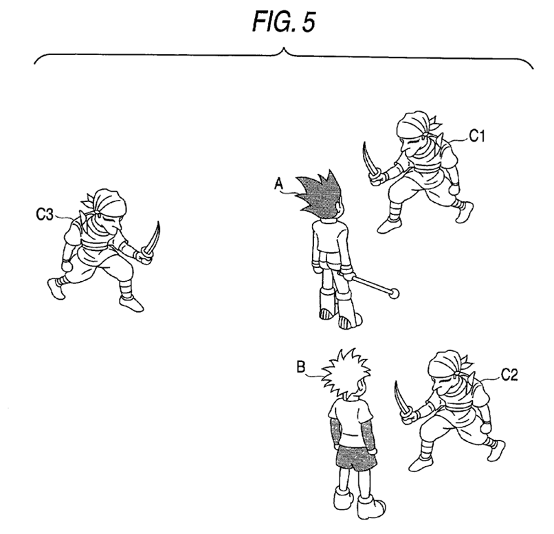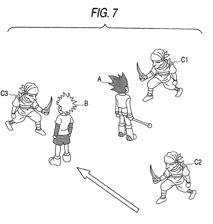 Yabe特許も同様に、プレイヤーキャラクターAとサブキャラクターBが登場するゲームを開示しています。ちなみに図5、図7のキャラクターは『ハンター×ハンター』のゴンとキルアのようです。Yabe特許の出願時(2001年頃)にコナミから発売されたゲームとして「Hunter×Hunter 龍脈の祭壇」があります。 Yabe特許のポイントは以下のとおりです。